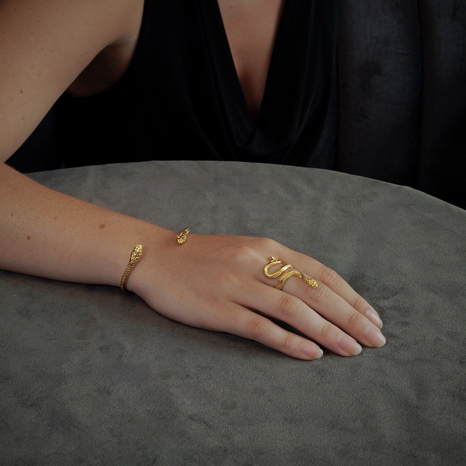 Dieser Armreif ahmt zwar die Form einer Schlange nach, beisst aber von beiden Seiten.