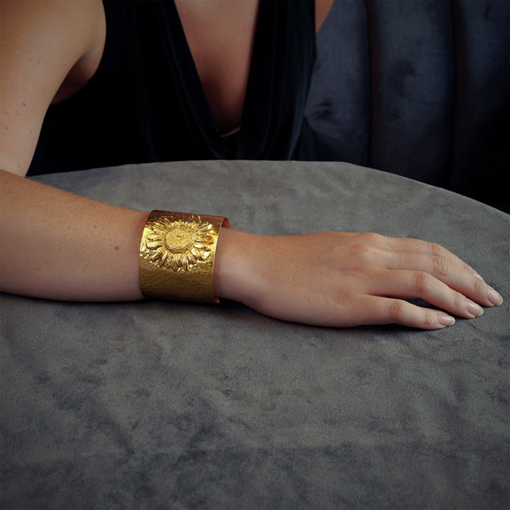 Der Armreif schmiegt sich um dein Handgelenk und seine gehämmerte Oberfläche strahlt mit der Sonnenblume um die Wette.