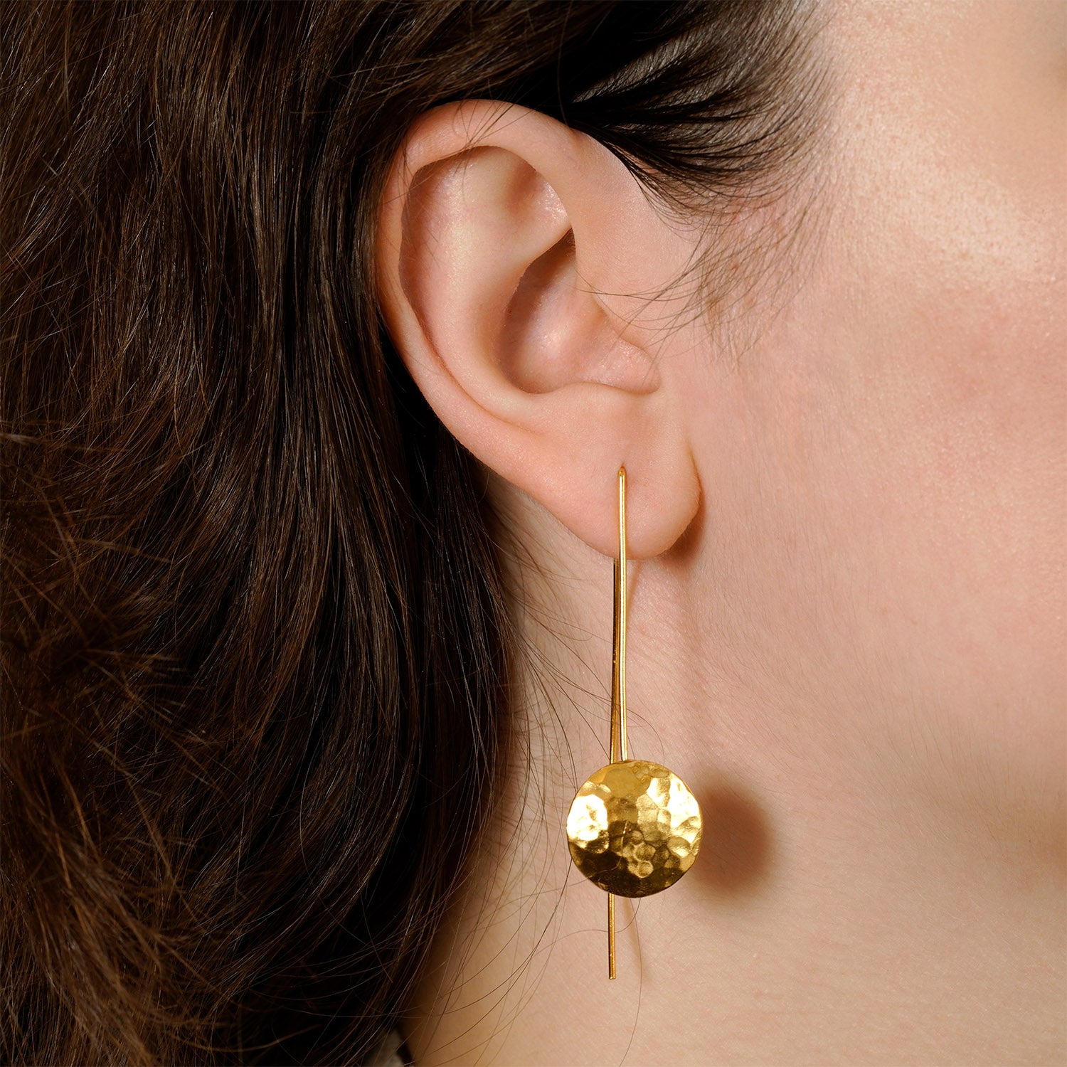 Die langen Bügel dieses Ohrrings sorgen für eine schlanke Ausstrahlung und enden in einem einfachen, auffälligen Design.